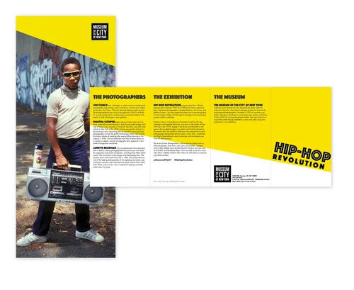 Three print pieces (poster, postcard, and brochure) and a microsite promoting the “Hip-Hop Revolution” exhibit at the Museum of the City of New York.